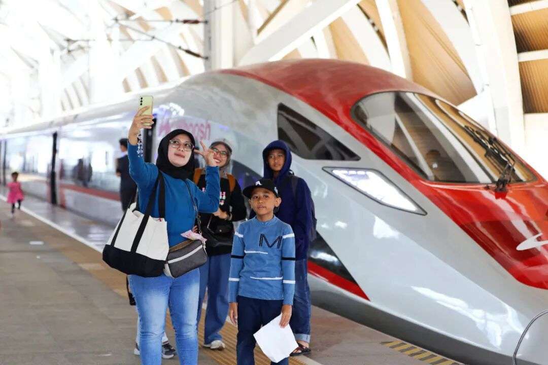▲当地时间2025年6月26日,旅客在印度尼西亚雅加达哈利姆高铁站与列车合影。中新社记者李志全摄