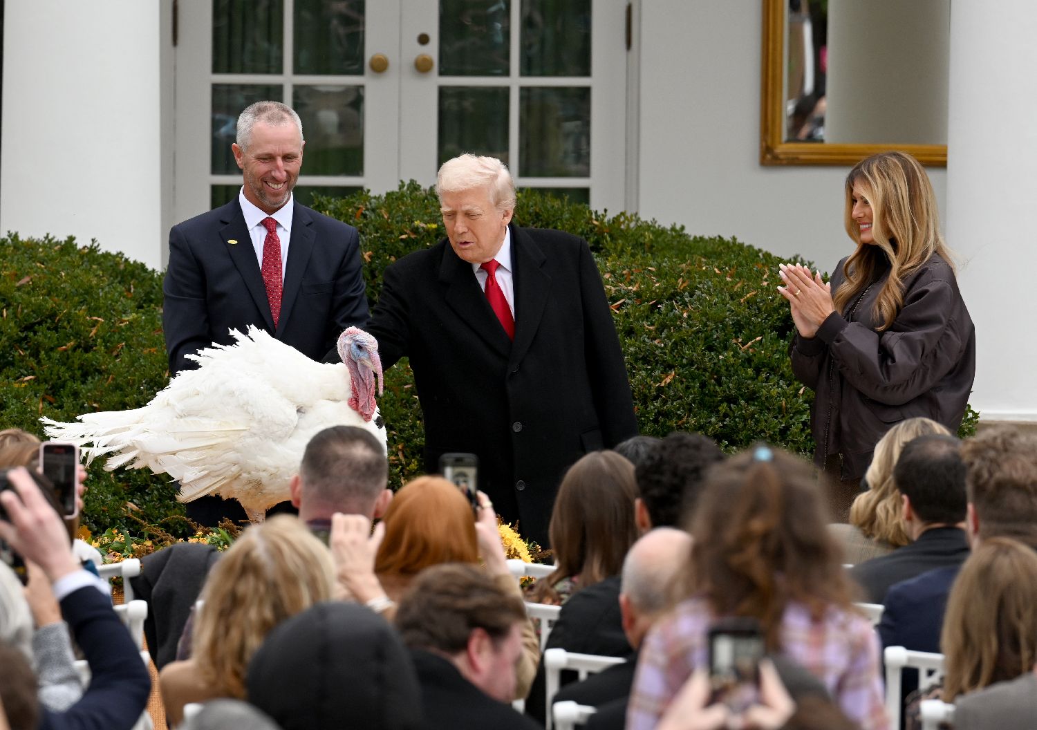 ▲当地时间11月25日,华盛顿,美国总统特朗普在白宫“赦免”2025年感恩节幸运火鸡“咯咯”(Gobble)和“晃晃”(Waddle)。(图片来自中新社)