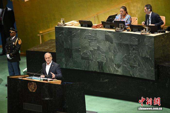 ▲当地时间2025年9月24日,纽约联合国总部,伊朗总统佩泽希齐扬在第80届联合国大会一般性辩论中发言。(图片来自中新社)