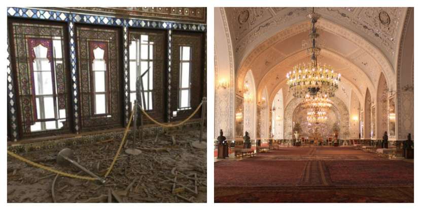 ▲空袭后的古莱斯坦宫(左)与空袭前的古莱斯坦宫(右)。均据联合国教科文组织官网