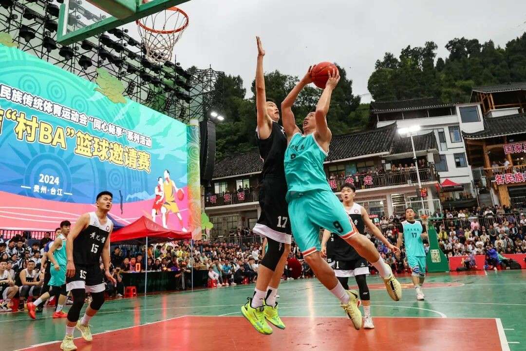 ▲2024年6月9日,第十二届全国少数民族传统体育运动会“同心畅享”系列活动——民族团结“村BA”篮球邀请赛在贵州省黔东南苗族侗族自治州台江县台盘村开赛。(图片来自中新社)