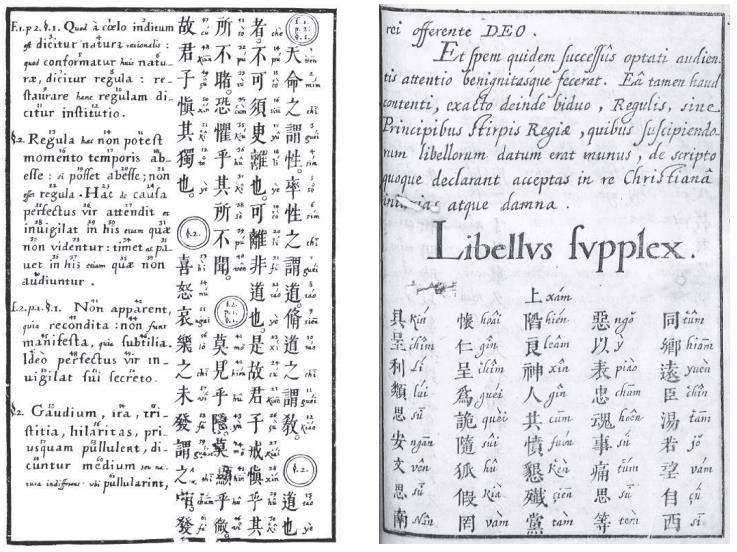 早在1584年,意大利人罗明坚在广州出版了中国第一本西洋书籍《天主实录》。从1666年3月至1671年9月,二十几位传教士在广州写下许多著作及报告,并在其间开始出版两本与中国儒家经典相关的语言教材,分别是《中国政治道德学说》和《无罪获胜》。前者完全依中国习惯,自右往左竖排;后者综合了中西不同的排版方式,自左往右竖排。双语竖排的书籍对技术的要求很特殊,在同一张刻板上既要刻汉字又要刻西文,必须与刻工密切配合。