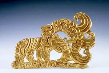 ▲交河故城出土怪兽啄虎纹金牌饰。(图片来自道中华微信公众号)