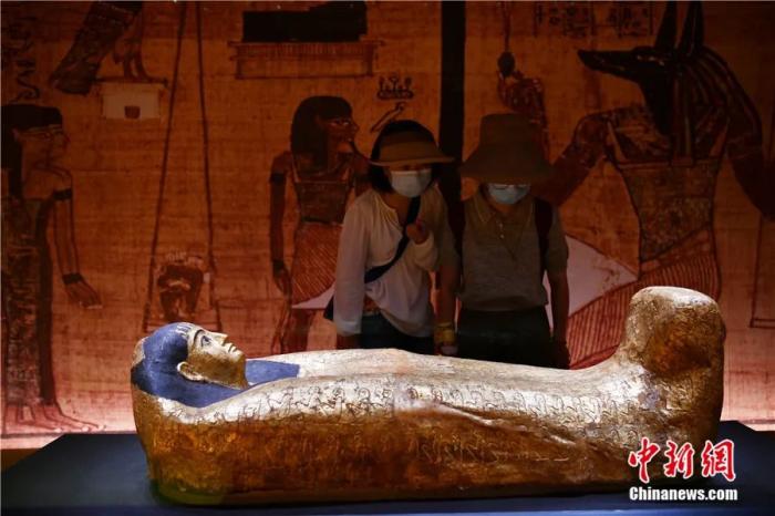 ▲2022年8月18日,“遇见古埃及-木乃伊大型文物特展”在遇见博物馆·成都馆开展,全身镀金木乃伊棺椁吸引参观者。摄