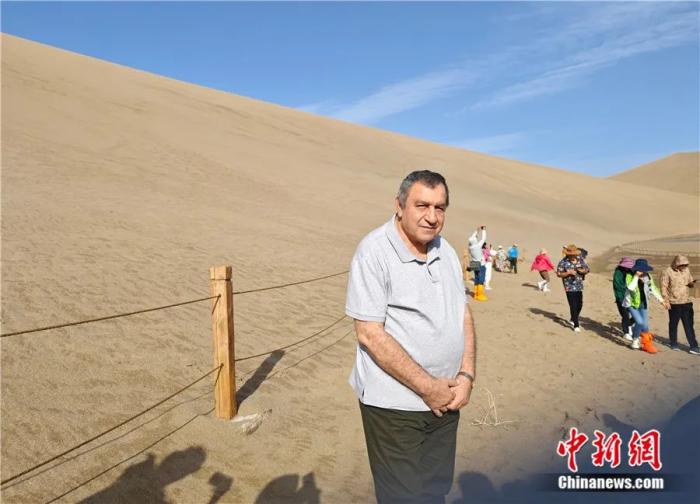 ▲2023年9月6日,伊萨姆·沙拉夫在敦煌鸣沙山留影。崔白露摄