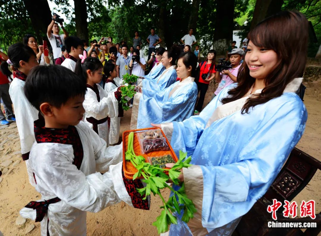 ▲2013年8日,近百名来自台湾的师生来到理学宗师朱熹的故乡福建省南平市五夫镇参观,了解朱子文化,延续尊师重教传统。图为台湾小学生身穿古代服装在朱熹故居前向老师献上芹菜、莲心、枣子、桂圆行传统的敬师礼。张斌 摄