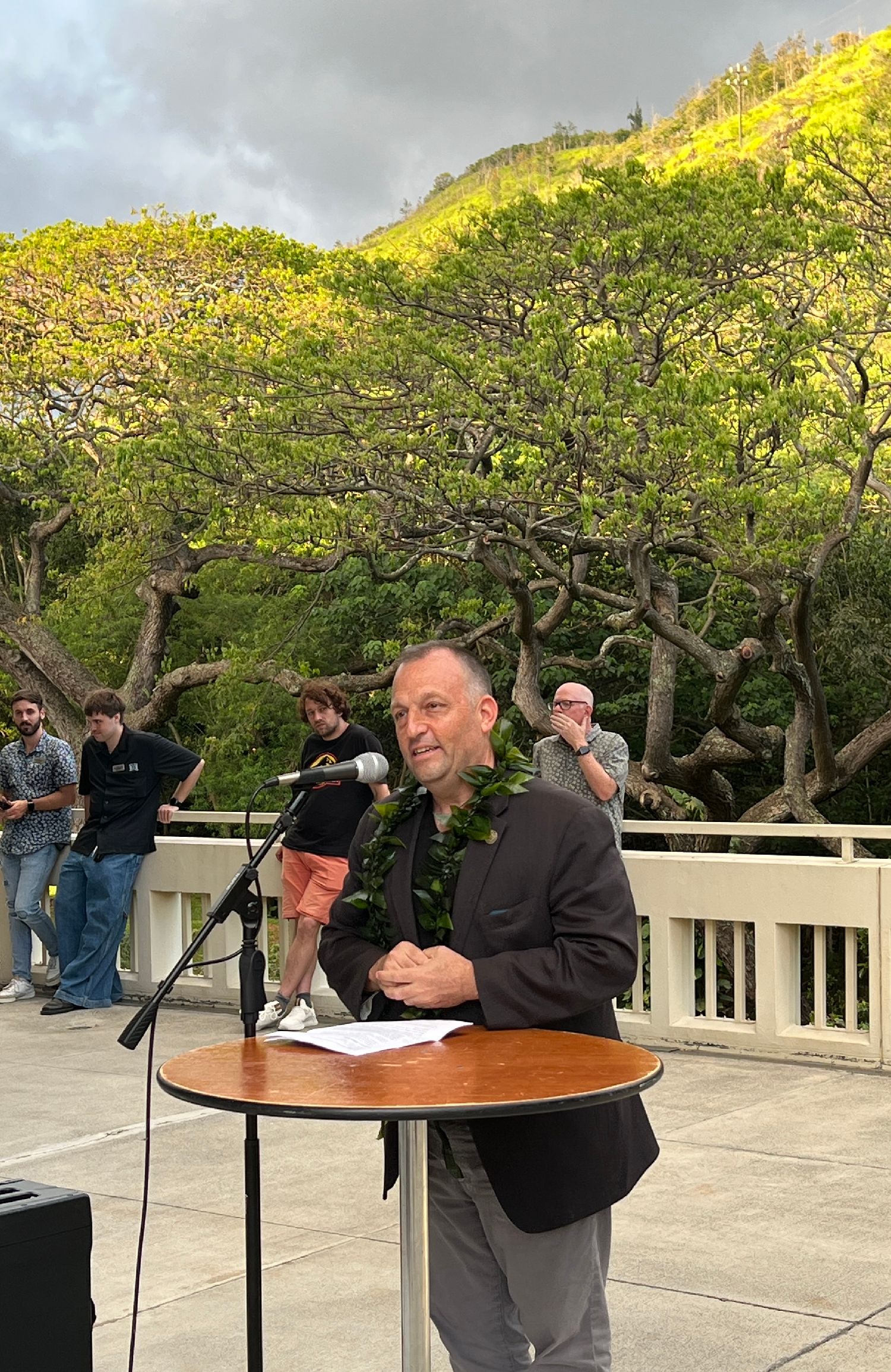 北京大学哲学系人文讲席教授安乐哲(Roger T.Ames)、夏威夷大学马诺阿分校哲学系主任塔玛拉·阿尔贝蒂尼(Tamara Albertini)和东西方中心中国项目主任何随德(Peter Hershock)担任第12届东西方哲学家大会主席,他们与夏威夷州州长约什·格林(Josh Green)等各界人士一同出席了24日晚在夏威夷大学马诺阿分校举行的开幕式。