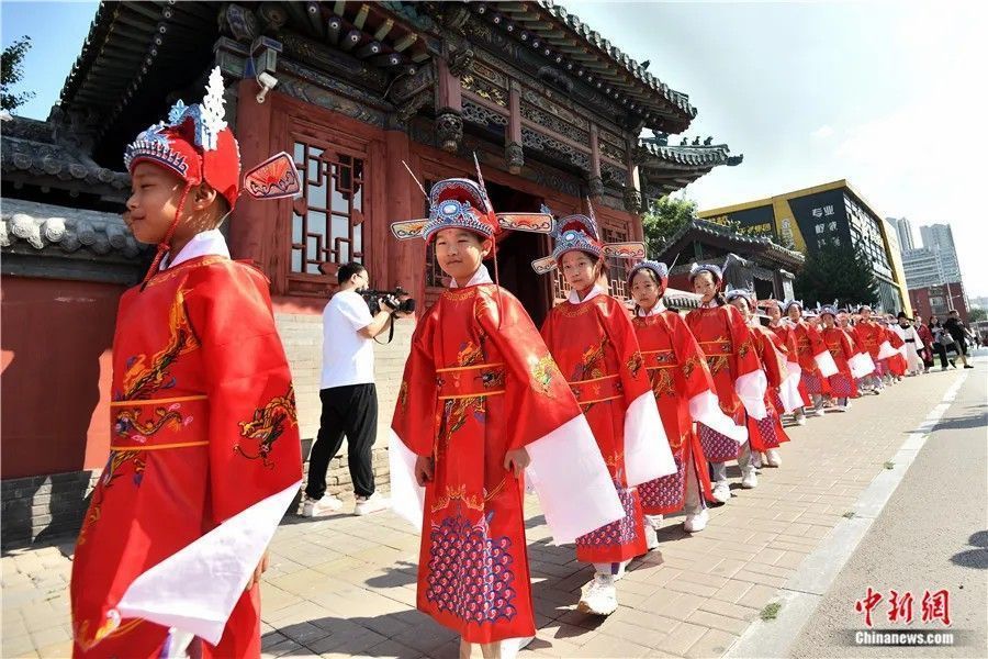 ▲小学生身着“状元服”在山西省太原市唱经楼参加新学期开笔礼仪式。唱经楼为明清时期科举考试后宣唱考生名次的主要场所。韦亮摄