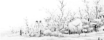 他取用简洁的意象来重现那夜,略过了许多细节:他只简单勾画出一个屋子,屋内一桌一凳,桌子后面立着一座素屏,桌上依稀可辨有香炉、酒杯、书册,或许还有烛台。树枝树叶,也皆如此,庭中散步的三人,也只用了寥寥几笔。