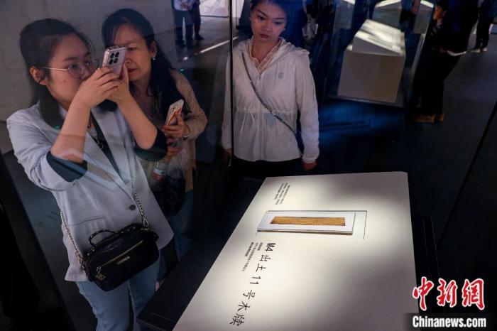 ▲2024年4月30日,观众在湖北省博物馆拍摄“惠此简书——睡虎地秦墓出土简牍”展览展出的木牍。中新社记者 张畅 摄