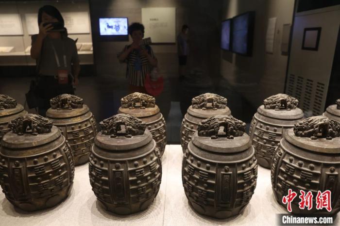 ▲2024年7月11日,山东曲阜孔子博物馆收藏的八卦纹鎏金铜编钟吸引参观者。中新社记者 蒋启明 摄