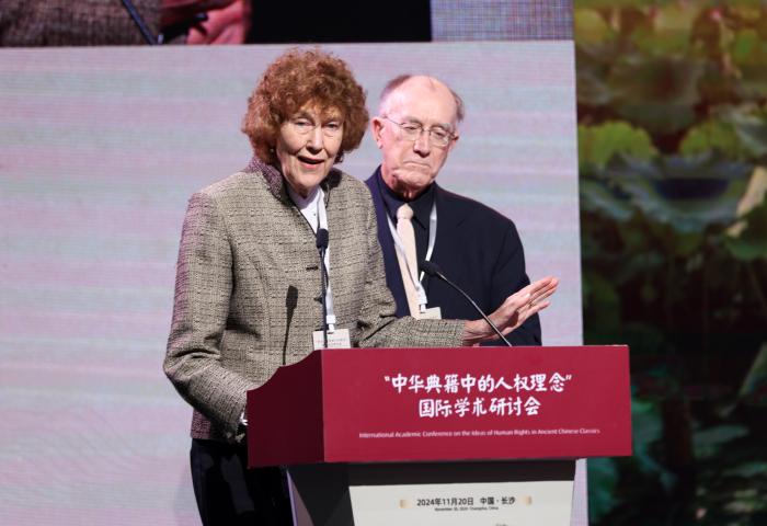 ▲2024年11月20日,“中华典籍中的人权理念”国际学术研讨会在湖南大学岳麓书院开幕。图为美国耶鲁大学林业与环境研究学院教授玛丽·伊芙琳·塔克(前左)在主论坛上发言。(中新社记者 贾天勇 摄)