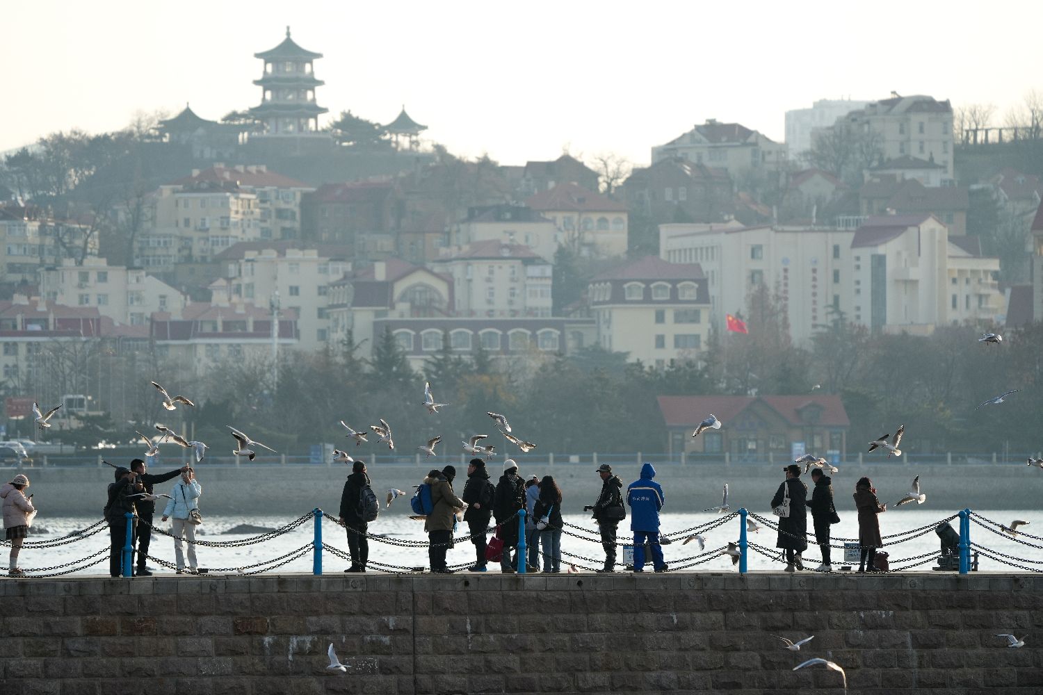 ▲12月19日,山东青岛栈桥景区,民众观赏红嘴鸥。每年冬季,大批红嘴鸥飞抵青岛越冬,形成一道冬日靓丽风景线。(图片来自中新社)