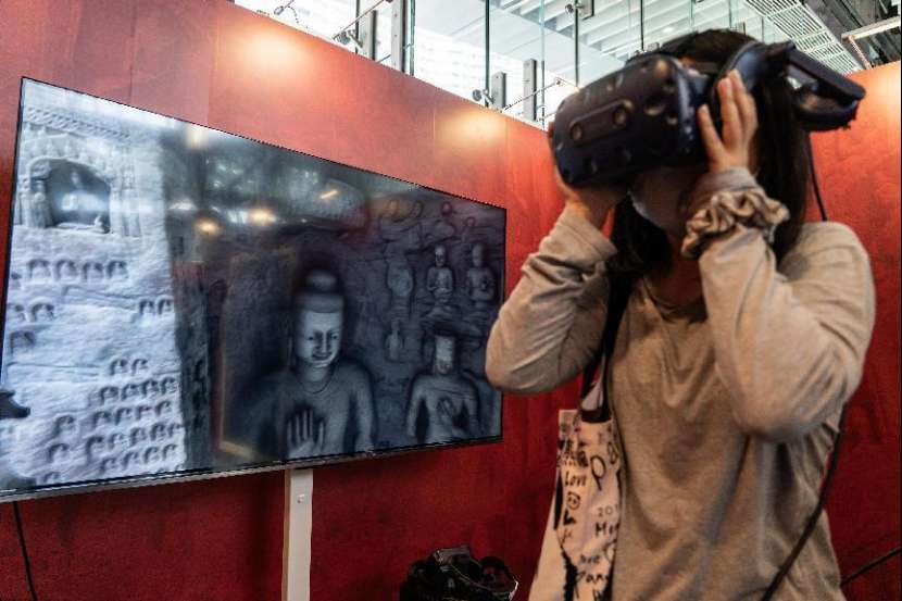 ▲2025年5月27日,“遇见云冈数字公益艺术展”在香港西九龙高铁站紫荆艺术展览空间亮相。图为一位女士通过AR眼镜隔空体验云冈石窟的魅力。中新网记者 侯宇 摄