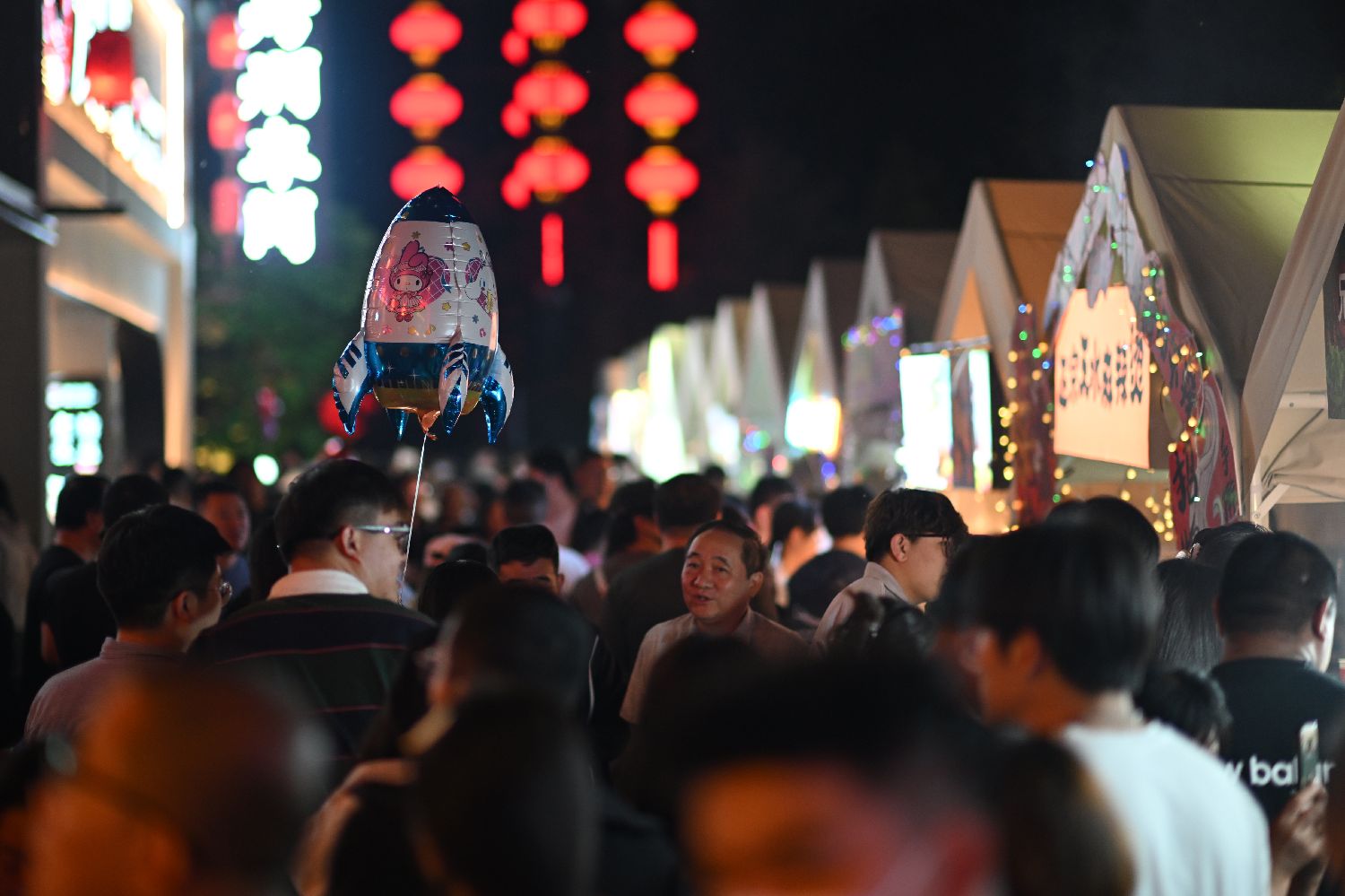 ▲5月3日晚,市民逛月亮河夜市。当日是“五一”假期第三天,北京市民逛月亮河夜市,乐享假日时光。(图片来自中新社)