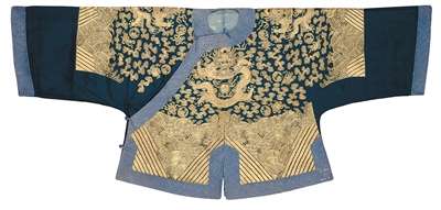 元、明、清时期,中央政府在边疆民族地区任命和分封少数民族头领为地方官员,这类官职统称为土司。宣慰使是土司中级别最高、权力最大的地方官员。石青色金丝织锦龙褂为乾隆赐给车里宣慰使的官服,车里辖境大致相当于今云南省西双版纳傣族自治州。这件龙褂身长70厘米,臂展155厘米,下摆宽74厘米,袖口宽32厘米,大襟右衽,圆领,平阔袖,四开裾,在石青色缎地面料上用金线绣制龙、云、八宝、蝙蝠、海水江崖等图案,针脚平齐均匀,金光闪闪,雍容华贵。领口、袖口、前后襟边缘饰以宽5厘米的灰蓝色金丝织锦。龙褂上共有4团五爪金龙,分布在前后襟和左右肩。龙首正面,头部左右对称,双目圆睁,正视前方,蜿蜒而坐,故又称正龙或坐龙,是龙纹中最尊贵的纹饰,反映了清朝中央政府对民族地区的高度重视。