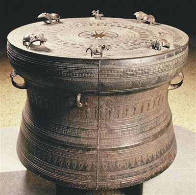 ▲汉代冷水冲型十二芒铜鼓。民族文化宫供图