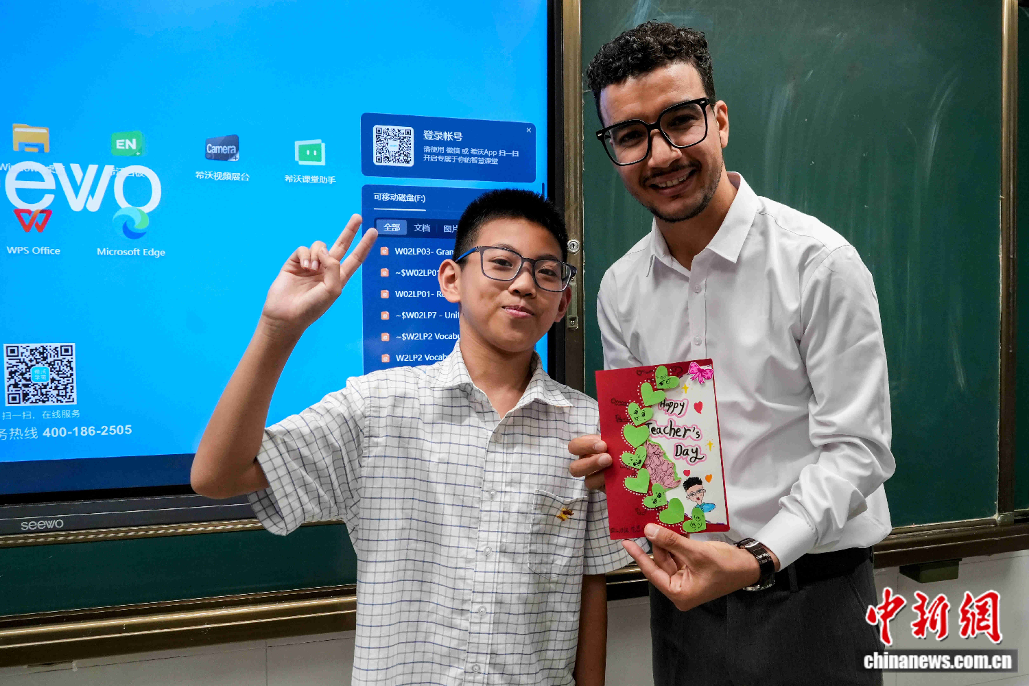 ▲2025年9月10日,河南省郑州市正弘小学,学生将手工制作的教师节贺卡赠送给外籍老师。中新社记者 范晓恒 摄