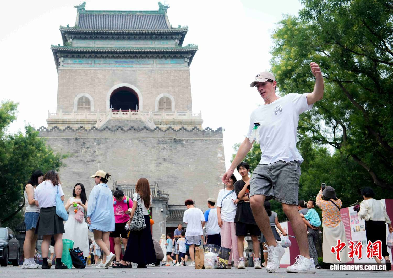 ▲2025年7月26日,外国游客在位于北京中轴线上的钟楼前踢毽子。中新社记者 赵文宇 摄