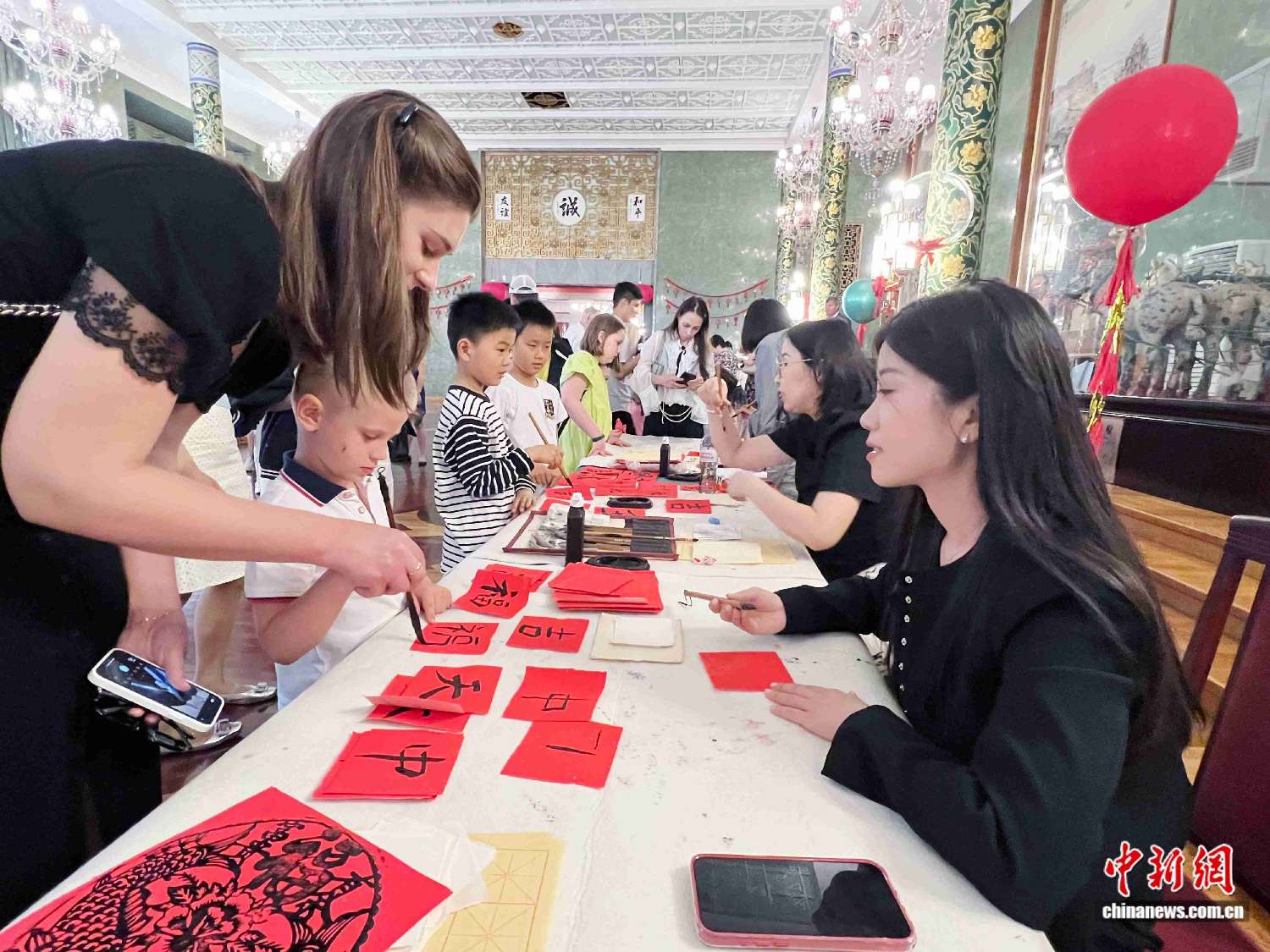 ▲当地时间2025年6月6日,中国驻俄罗斯大使馆在馆内举办“六一”国际儿童节大型招待会。图为中俄两国小朋友一起沉浸式体验书法、剪纸、雕版印刷等中华文化展示活动。中新社记者 田冰 摄