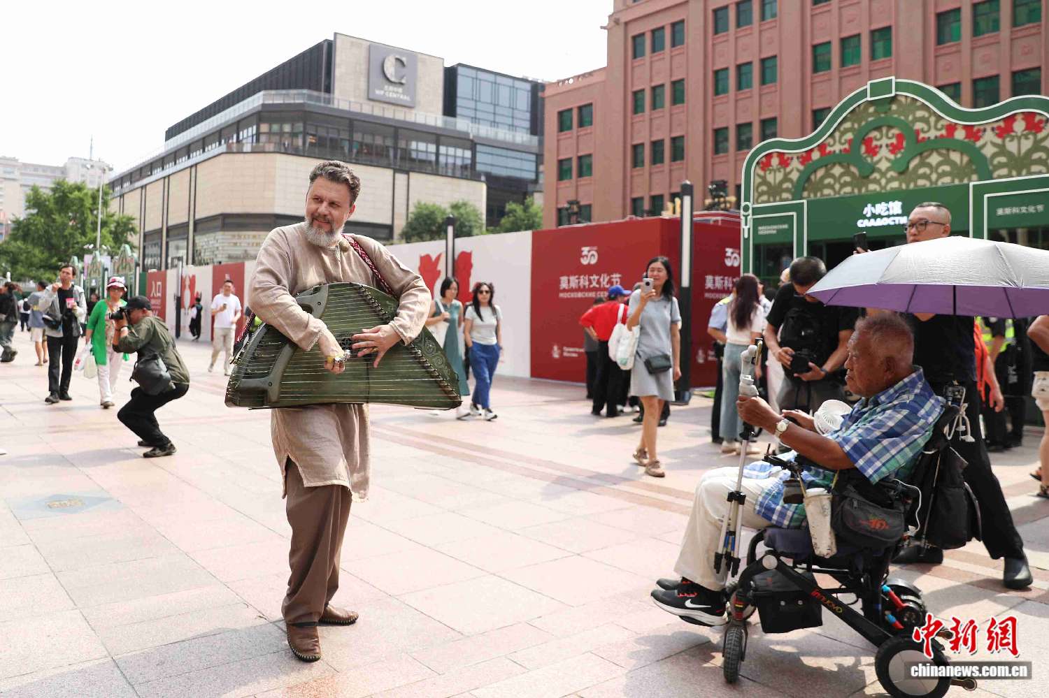 ▲2025年6月12日,莫斯科文化节在北京开幕。图为俄罗斯音乐家在王府井大街演奏俄罗斯民族乐器古斯里琴。中新社记者 王紫儒 摄