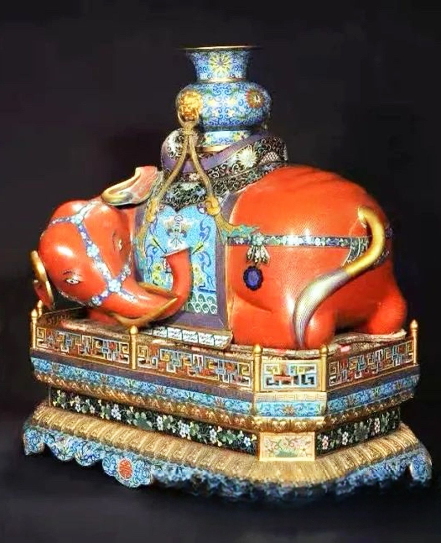 太平有象是中国传统吉祥纹样。象在古代是一种瑞兽,厚重稳行,能驮宝瓶,故有“太平有象”“喜象升平”之说。《汉书·王莽传》载:“天下太平,五谷成熟。”陆游也曾赋诗曰:“太平有象天人识,南陌东阡捣麦香。”吉祥图案常画象驮宝瓶,瓶中还插有花卉作装饰,代表天下太平、五谷丰登。清代景泰蓝太平有象,现藏于秦皇岛博物馆。这尊带座卧象姿态温顺,比例恰到好处,装饰华丽,造型精致细腻,展现出清代宫廷艺术的富丽堂皇和景泰蓝工艺的高超水平。其全身遍布金丝勾勒的毛发,黑白分明的眼睛,金灿灿、明晃晃的象牙,掐丝珐琅的金色尾巴,都让人叹为观止,象鼻卷曲处蓝绿黄三色心形纹如宝石镶嵌,象耳血管也以深蓝掐丝还原,更显工艺精湛。回字形褡子边纹,寓意连绵不断、吉利永长。以云纹为地、两侧纹饰飘扬的执扇,寓意风调雨顺、福寿安康。主图是口衔三线、系着珍珠的蝙蝠,寓意珍宝就在眼前。中间珍珠下挂磬形物,内饰花朵纹,寓意吉庆有余;磬两侧分别装饰三个灵芝如意头,寓意万事如意、好事连连。下绘海水和山石,寓意福如东海、寿比南山。