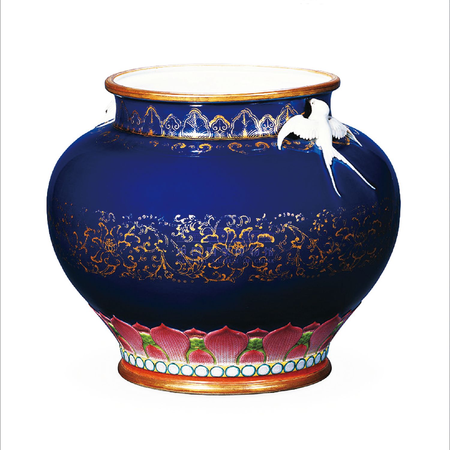 海晏河清,也作“河清海晏”,意指黄河水流澄清,大海风平浪静,用以歌颂天下太平。唐代郑锡的《日中有王字赋》即有“河清海晏,时和岁丰”之说;宋代释道原的《景德传灯录·潭州水西南台道遵和尚》亦有“一言启口,震动乾坤,山河大地,海晏河清”的描述。现藏于中国国家博物馆的霁青釉金彩海晏河清尊,瓷尊高敞口,短颈,丰肩,鼓腹,腹下部内敛,肩颈之间雕贴一对白色的展翅剪尾燕子作为耳,宛如一位稳重优雅的绅士。外壁施霁青色釉,以金彩绘蕉叶、缠枝花卉等纹饰,近足部饰粉彩仰莲纹及联珠纹。外底有青花篆书“大清乾隆年制”六字款。此尊需多次入窑和施彩,制作集雕、贴、凸压之大成,工艺高超。霁青色象征河清,燕子与“晏”谐音,整件器物蕴含海晏河清,四海承平之意。据悉,瓷尊共有一对,是景德镇御窑为圆明园海晏堂烧制的陈设品,在乾隆皇帝五十大寿那天被进献。1860年,圆明园连同海晏堂遭英法联军劫掠焚毁,但这对海晏河清尊幸运地保存了下来,如今静静伫立在博物馆展厅内,向人们讲述那段颠沛流离的岁月。