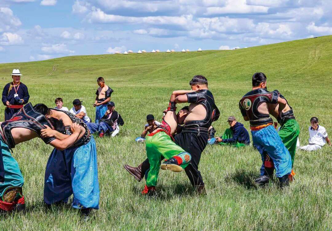 ▲内蒙古呼伦贝尔大草原文化旅游节上进行的搏克比赛。(图片来自新华社兰 红光 摄)