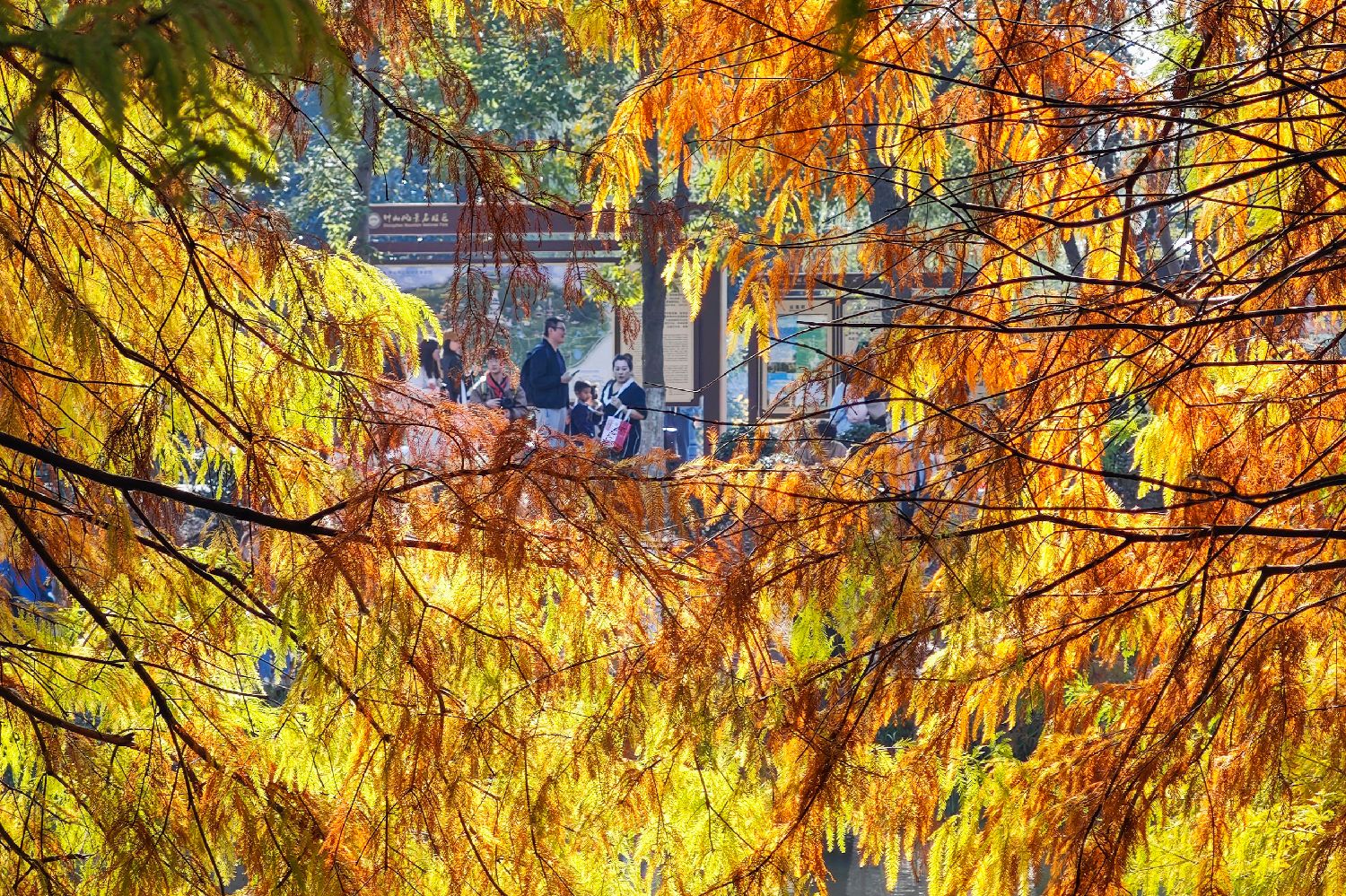 ▲11月13日,江苏南京燕雀湖色彩斑斓,“绘就”出的天然画卷吸引民众前来,拍照留影享受美好。(图片来自中新社)