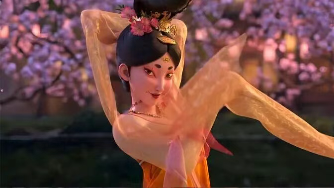 ▲动画电影中额间贴金箔花子的舞姬。(图片来源:《长安三万里》)