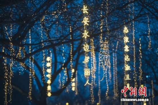 ▲大雁塔东西两侧步行街的树枝上挂满了唐诗彩灯。图自中新网
