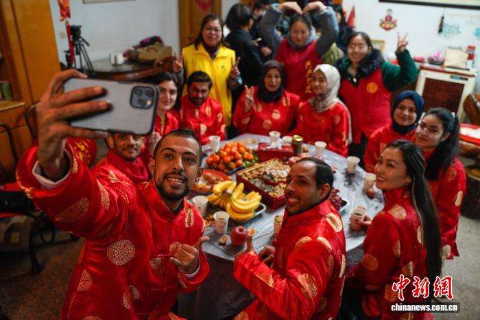 ▲2022年1月25日,外籍学生、客商等欢聚一堂,身着“中国红”服饰,共度中国小年并体验当地民俗。中新社记者 董易鑫 摄