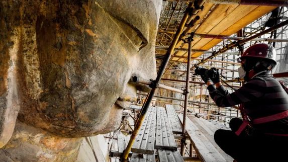 龙门石窟研究院石窟保护研究中心主任马朝龙告诉《中国新闻周刊》,1971年开始,卢舍那大佛所在的奉先寺曾首次进行过系统性加固和修复,时隔50年后,2022年7月,奉先寺再次完成了历时228天的大型渗漏水治理和危岩体加固保护。50年后的又一次大修,龙门石窟研究院同时借机进行考古研究和数据采集,依托脚手架,一架三用。