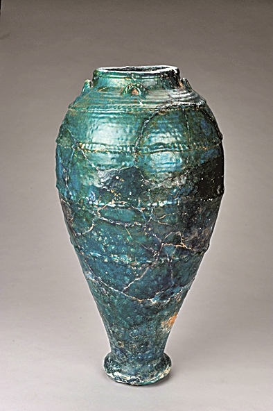 它们器形硕大,高度接近80厘米,状如竖立的橄榄,表面施有一种介于蓝绿之间的釉色,犹如孔雀尾羽般绚丽,是我国最早发现的孔雀蓝釉类器物。