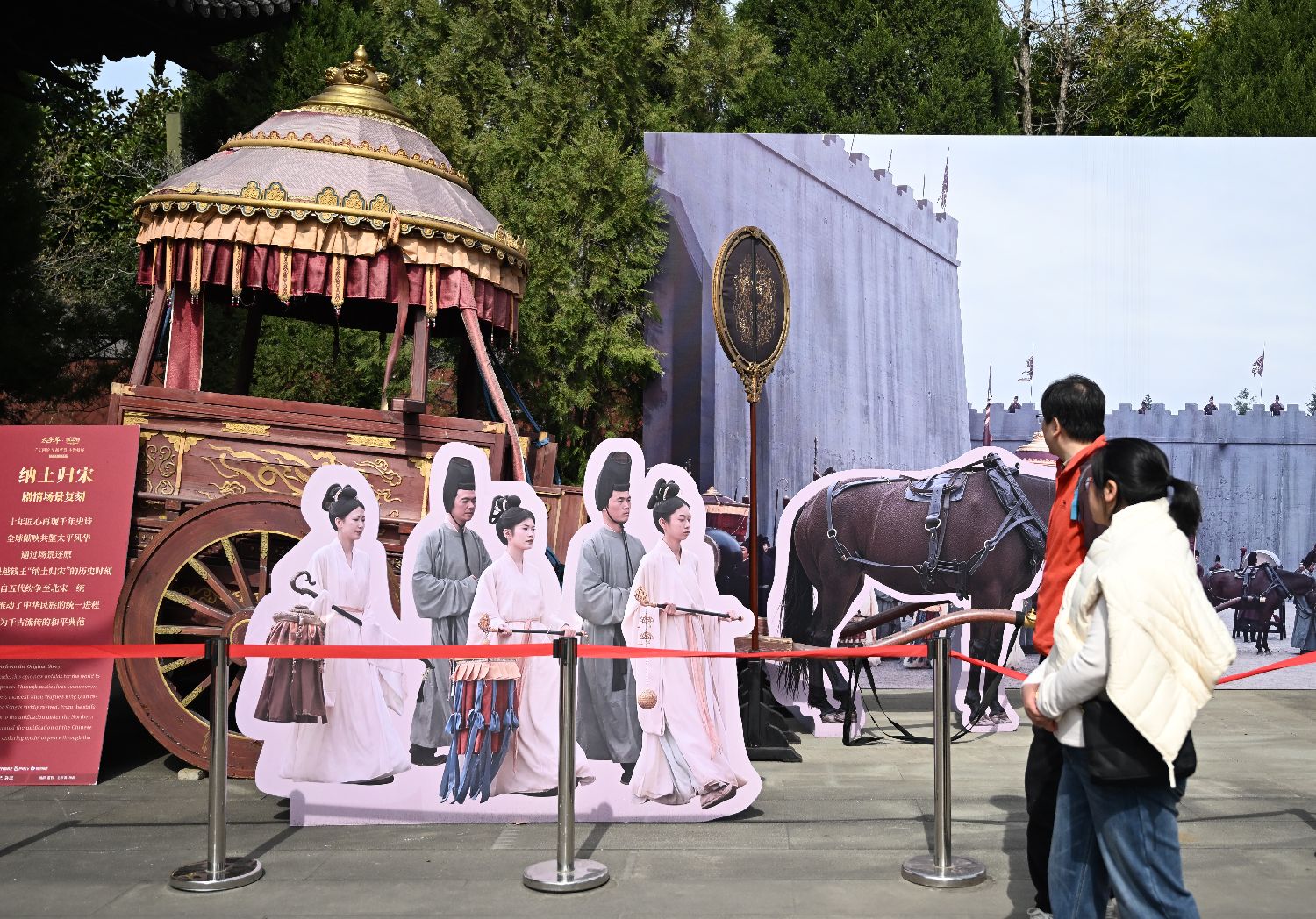 ▲2月23日,浙江杭州,游人在钱王祠了解纳土归宋剧情场景复刻。近日,随着影视剧《太平年》热播,不少游客在西湖打卡钱王祠、雷峰塔等景点,感受剧中的吴越文化。(图片来自中新社)