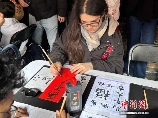 ▲2026伦敦卡姆登市集中国春节庙会,一名英国当地居民学习写汉字。(图自中新网)