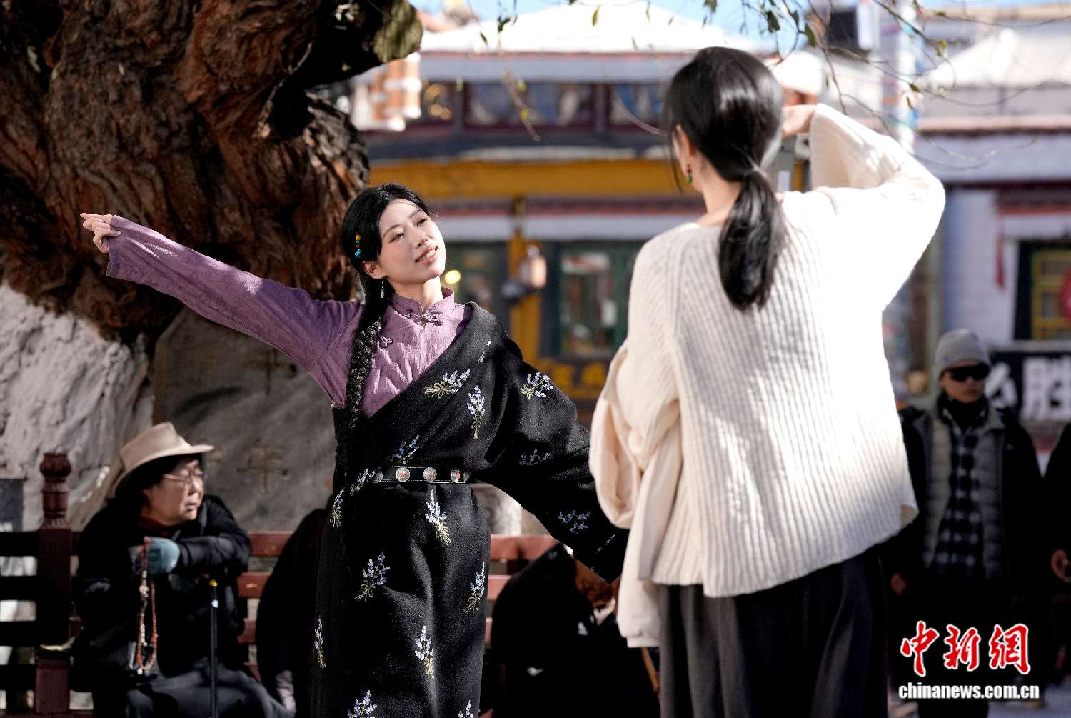 ▲2025年12月24日,游客在拉萨市八廓街拍摄藏服写真。在第八轮“冬游西藏”活动持续推动下,不少游客选择在冬季走进西藏,感受雪域高原的独特魅力。(图片来自中新社)