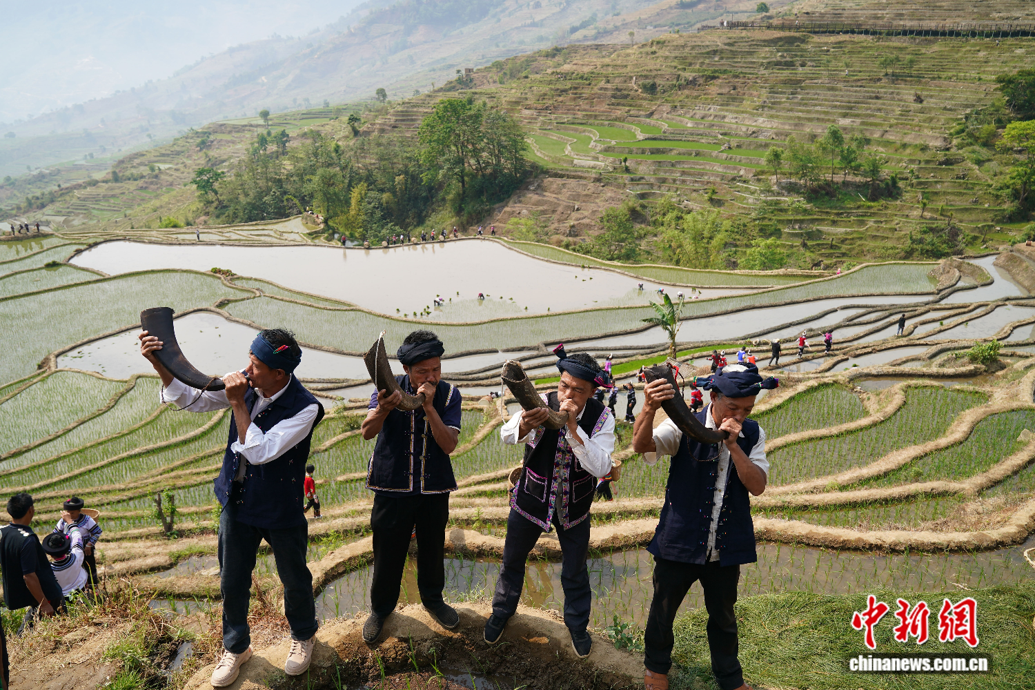 ▲2023年4月22日,云南红河县在撒玛坝万亩梯田举行“开秧门”仪式,这是当地哈尼族村寨迎接播种的传统仪式,标志着春耕生产正式开始。图为哈尼族民众吹响牛角号。中新社记者 刘冉阳 摄