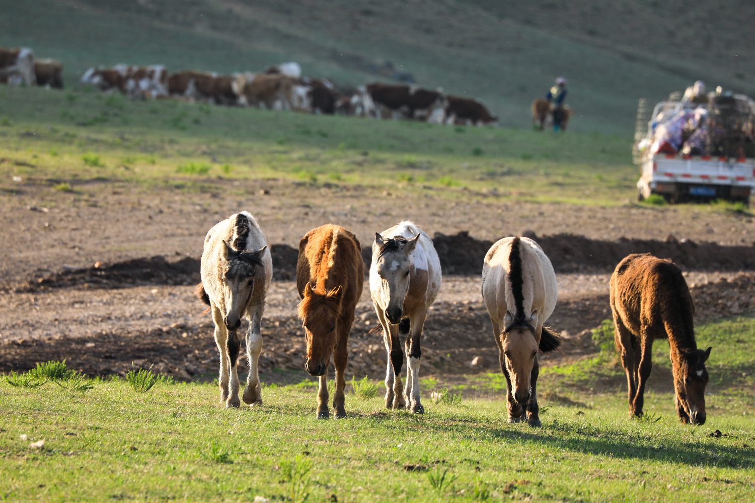 ▲2023年6月16日,内蒙古赤峰市阿鲁科尔沁旗,当日是阿鲁科尔沁游牧系统启幕夏季转场的第一天。图为牲畜在转场途中。中新社发 巴雅尔图 摄