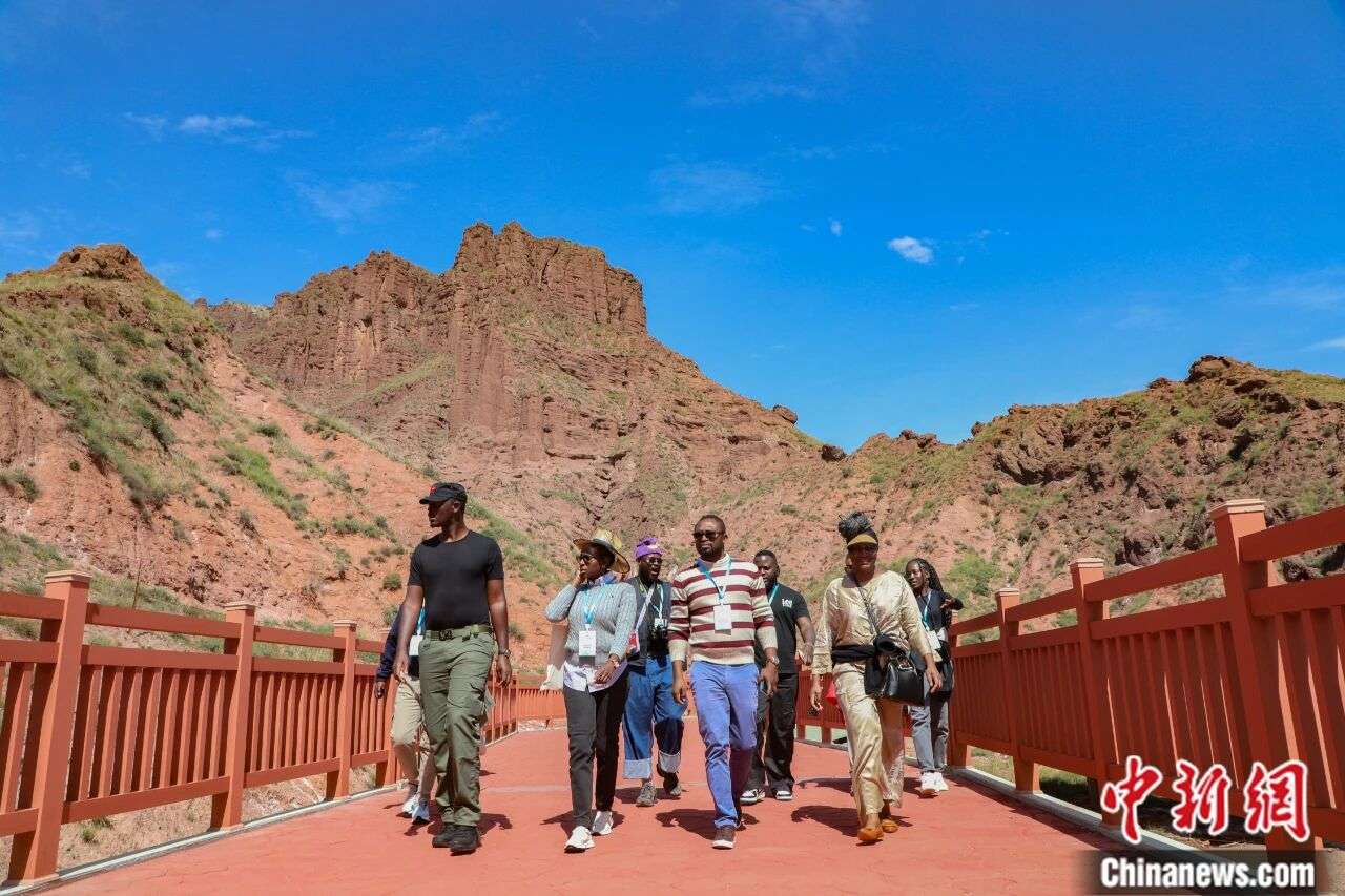 ▲2025年9月11日,第九届中非青年大联欢代表团和非洲记者团一行走进位于青海省坎布拉世界地质公园,观赏丹霞地貌等景观,了解当地生态保护成效。(图片来自中新社 马铭言 摄)