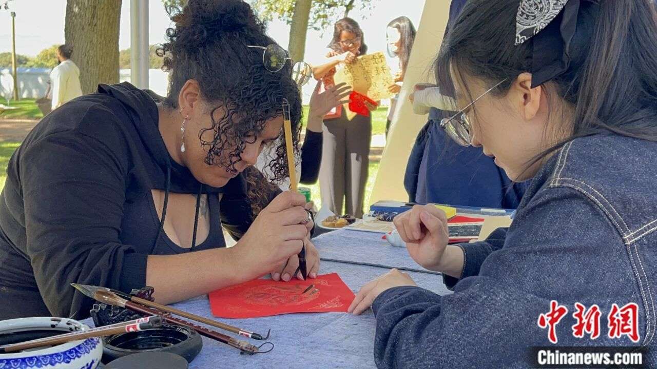 ▲当地时间2025年4月17日,南非民众在开普敦伊兹科(Iziko)博物馆体验写“福”字。(图片来自中新社 孙翔 摄)