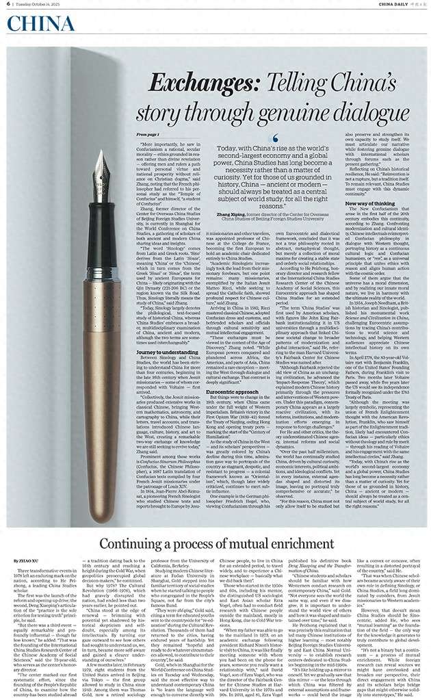 据张西平介绍,"中国学"的源头可追溯至16世纪末耶稣会士来华——其中一些人与伏尔泰保持着书信往来。"耶稣会士以古典中文撰写了大量著作,将西方的数学、天文学和制图学传入中国;与此同时,他们的信件、游记与译作又将中国的语言、文化、历史与艺术介绍给西方,开创了知识双向交流的盛景。"他说。