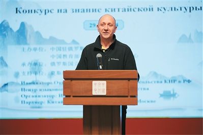 ▲2024年11月,易福成在“全俄大学生中国文化知识大赛”开幕式上致辞。(受访者供《人民日报海外版》)